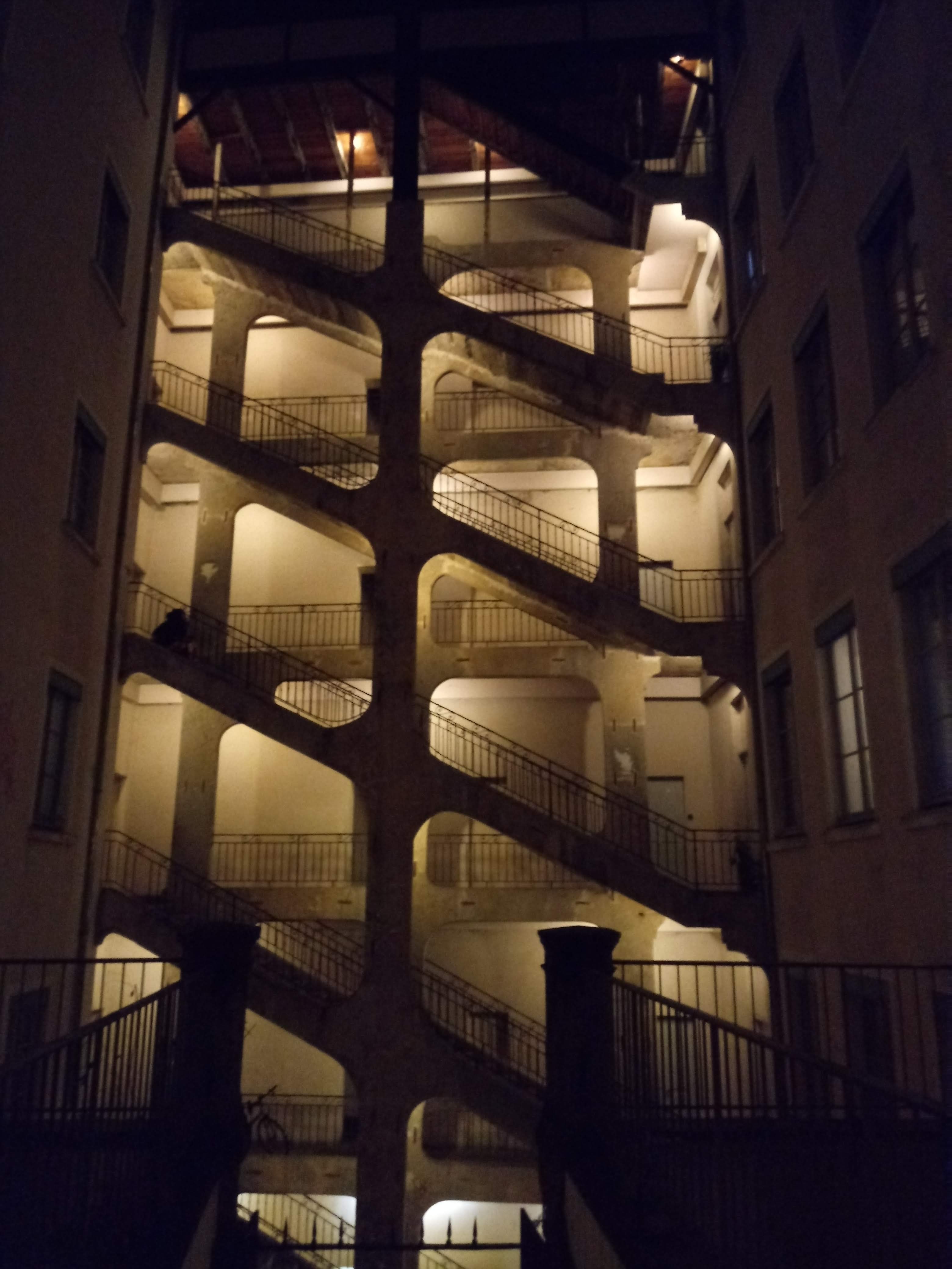 The photograph shows a series of staircases lit up, rising to the top of the building. Railings ascending, the stairwells connect the floors, crossing sides and linking them together. The stairway exposed, ironwork and stone pillars; it is as though one partition, one side of the edifice has been removed, like a doll’s house.