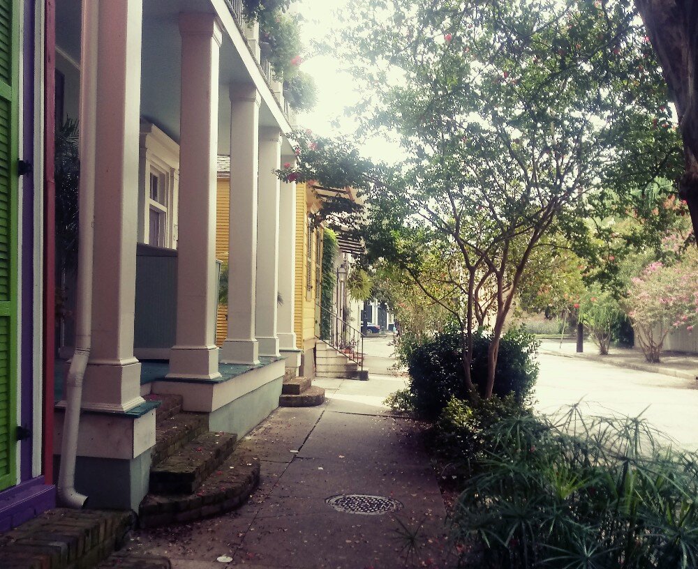 There are pillars with overhanging roofs and lanterns, steps out onto the street. We walk the pavements through trees and plants, depth and shade, and flowers pink and red. Looking down the tree lined street, pillars next to the trees, and shutters purple and green, blue and white, yellow in the streets beyond the French quarter, in Marigny and Bywater. A play of light and shade, shade and light.