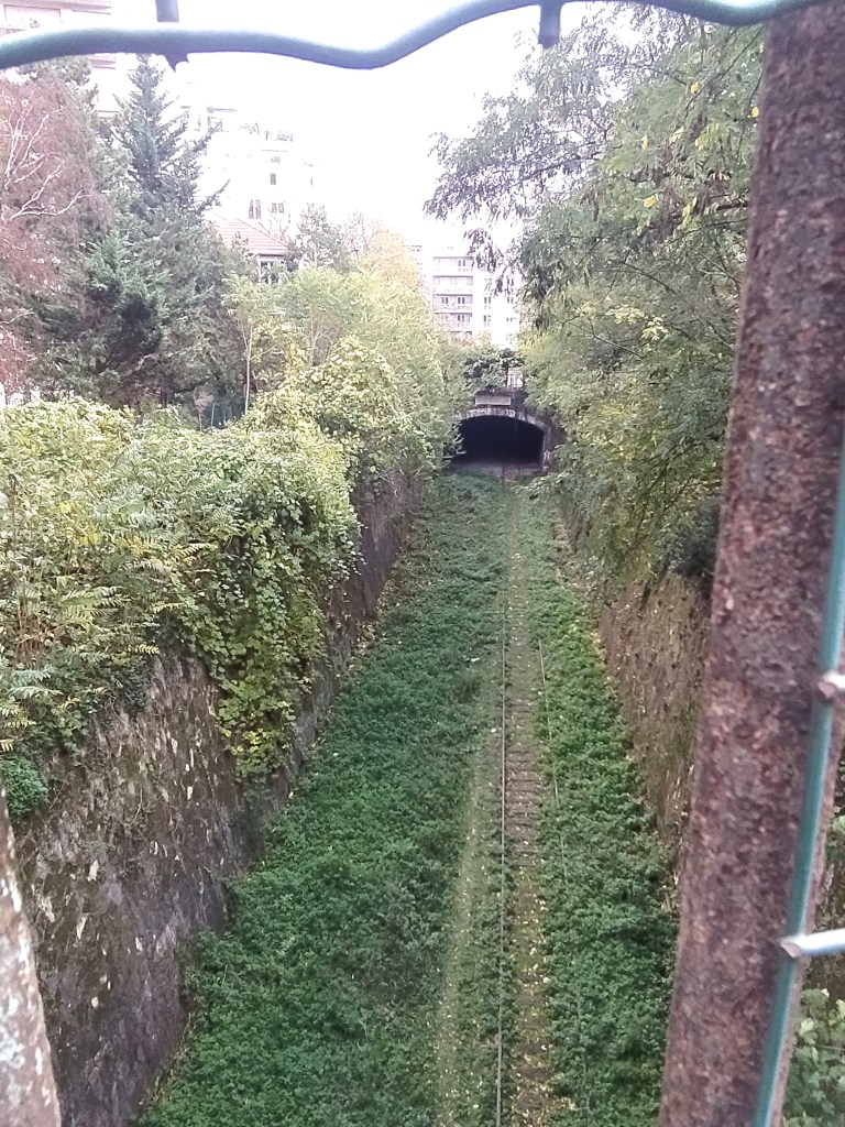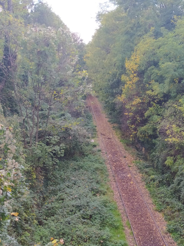 Walking through the thirteenth arrondissement, near the Parc Montsouris, I catch my first glimpse. Looking down from the road through a gap in the railings, an opening that frames a section of the railway line. The iron railings with their decorated curves and spikes, the leaves that gather at the edges. I feel a deep sense of excitement and unease. The track overgrown and partially concealed bending towards a bridge under which the line passes, turning a corner and out of sight. A wire fence stretches across my view. My camera blurs to play with perspective.