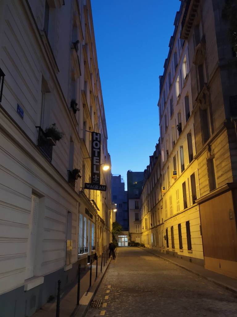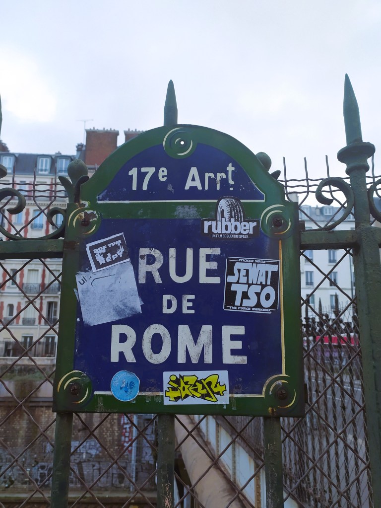 A walk along the rue de Rome at dusk, a wide expanse of train tracks glimpsed through the wire fencing. I find the street name so evocative, and the change of light seems the perfect time to get a sense of this place, passing alongside the tracks, the sky opening wide, the streets fanning outwards. I walk along lively Parisian streets as people are returning from work and making their way home or stopping for a drink and to meet in cafes. Trees and the faƧades of apartments fold into the falling light of evening. At this hour, the buildings are illuminated, and their windows are lit up. A mysterious shadow begins to fall over all these passages and hotel signs, the blue of the slowly darkening sky contrasts with the yellow light falling on the white of the walls. Here a figure stumbles along, adding footsteps to my story, adding doorways and the entrances to buildings.