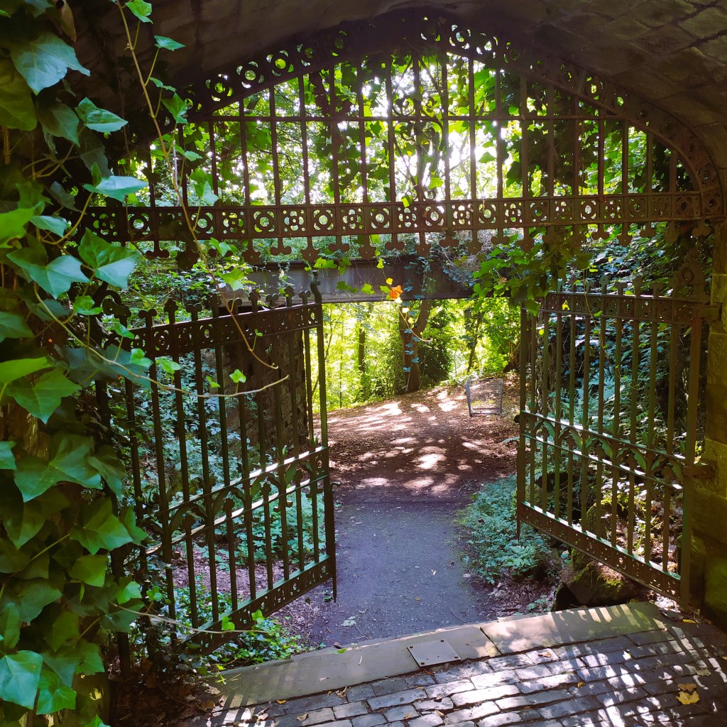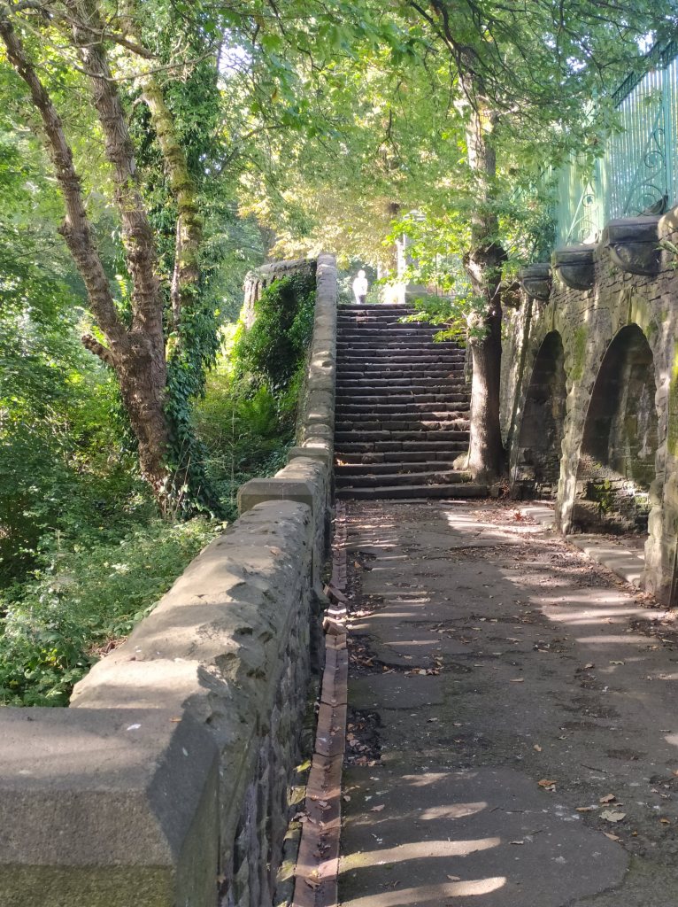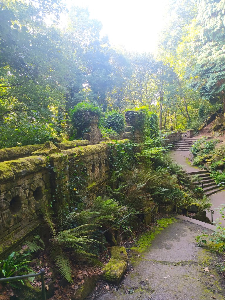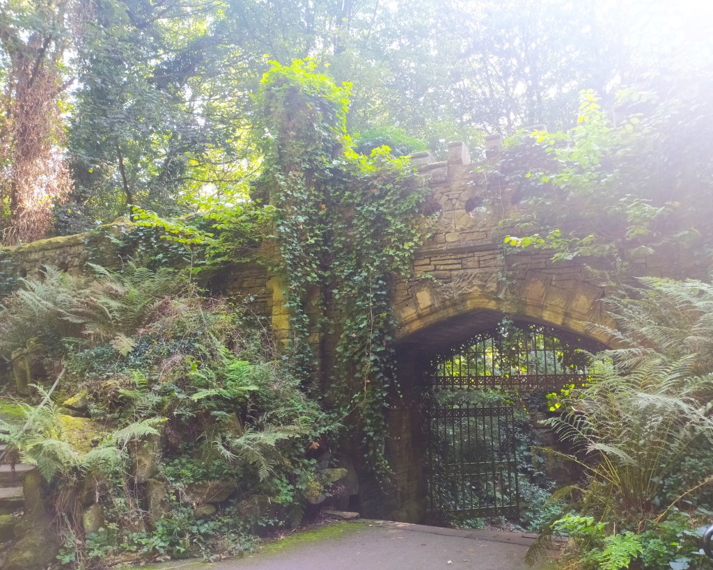 There are the old iron fences I remember, and countless rhododendrons, those rich and shiny leaves that remove light. The stairs are cracked, made from carved stone blending into their surroundings. There is something uncanny about these stairs for me, their familiar shape altered by time. Before its decline, the railway branch line brought visitors to wander the park, with its grandiose vision of castles and grottoes, cascades and fountains; a forgotten and enchanted realm, that can be traced through old photographs.