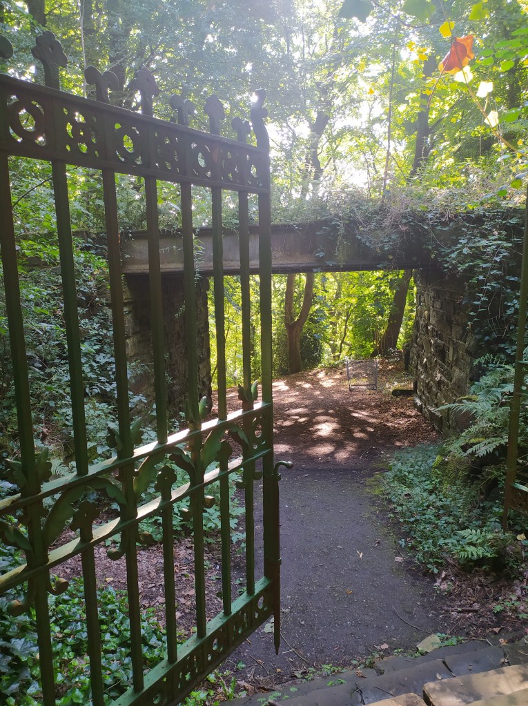 I look down into the narrow steep valley, and the line cut into it where the railway once ran. Trees bend across the path and emerge at different angles from the ridge, where I stand. Branches grow in all directions, and the roots of the trees are visible across the sloping path I follow. To one side lies the end of the railway line, a tunnel blocked off with bricks and disappearing into the valley, its exact course unknown. To the other side the cemetery and beyond that the road towards the village of Meltham, the destination of the branch line.