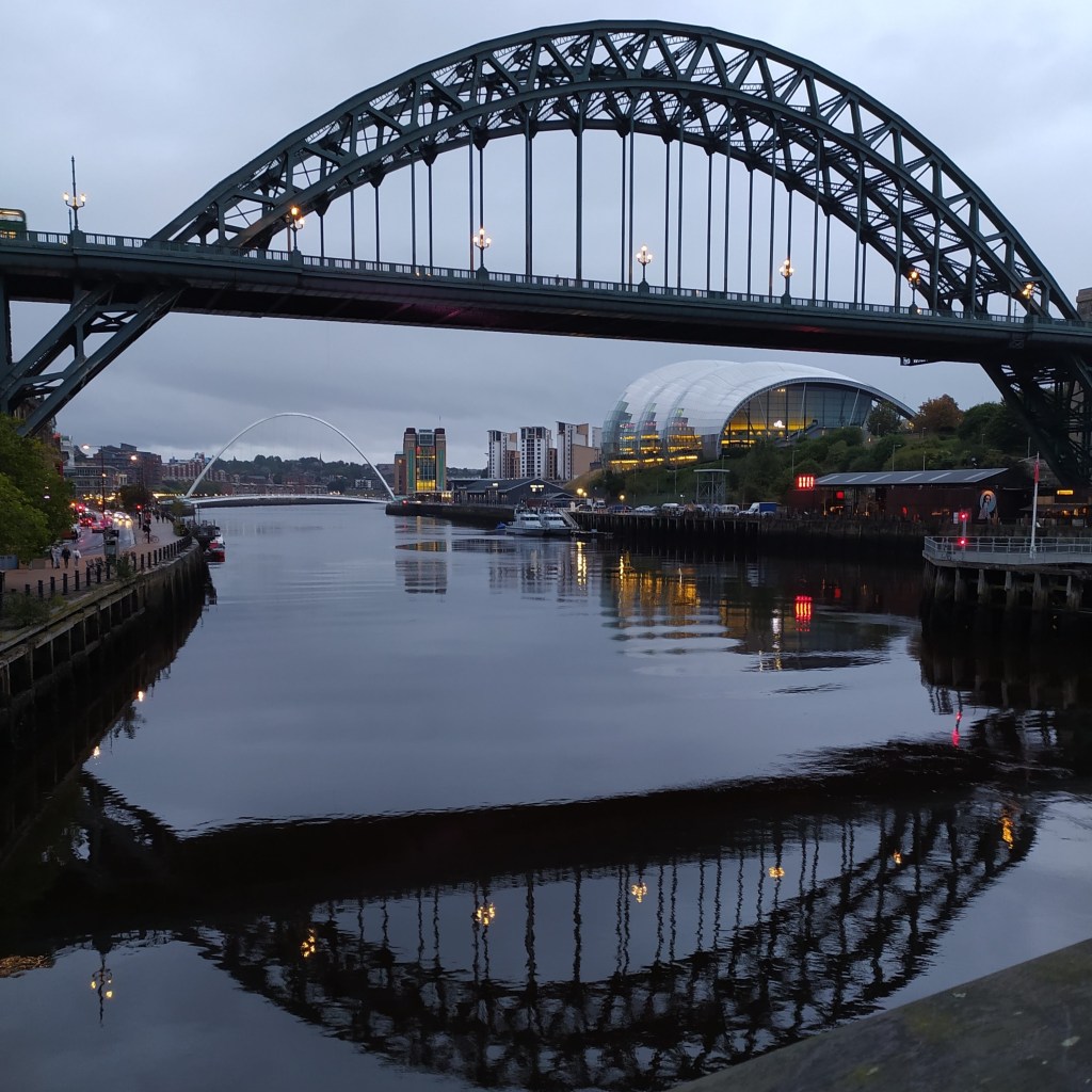 The Tyne Bridge casts a long and deep reflection in the water. The quayside is lit and full of life. I am grateful for the dusk, that portal of time that offers a glimpse into the meaning of places. Threading my memories of the city together like beads of light. In my photograph, the sweep of the bridges and a bus crossing over, an illuminated blur in motion.