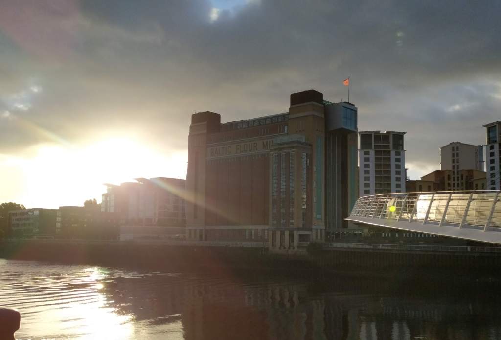 When I look back now, the scene behind me is lit once more. The sun points its diagonal rays to light up objects selectively. It strikes the windows on the side of the Baltic Flour Mill on its way but obscures the bridges. The paving stones along the quayside are bathed in light, and the buildings golden yellow. Behind loom the dark grey clouds, dense and ominous, contrasting with the buildings the sun picks out.