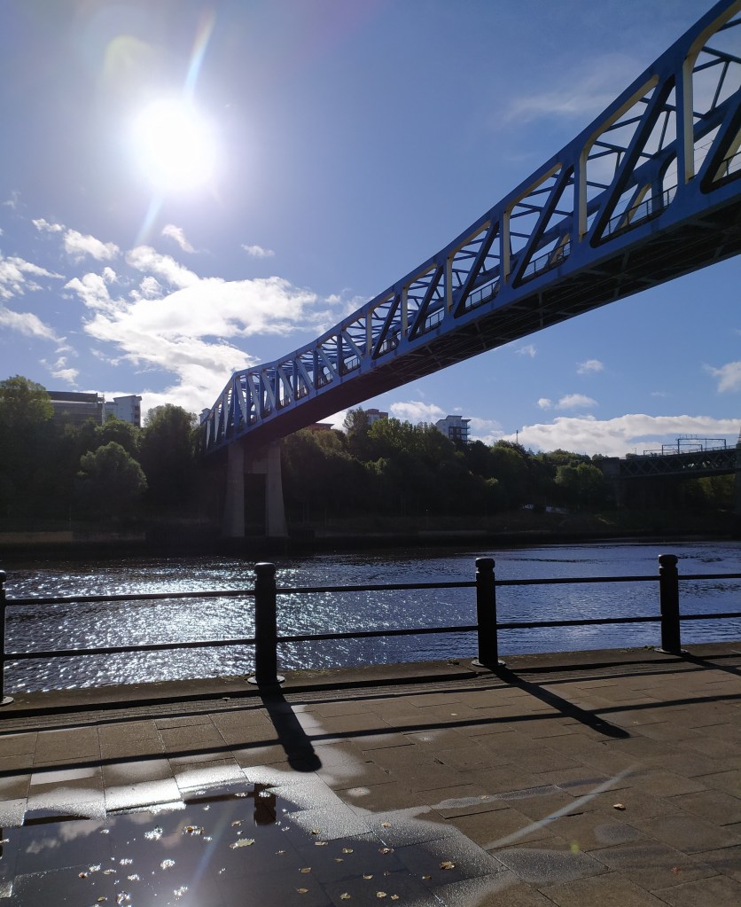 As I set out, the sky is a clearer blue and I am glad for the clarity of the light. I love the feeling of being out in the morning with hours of exploring ahead. The bridges present themselves in a dynamic view for walking. Their reflections plunge deeply into the rippled lightness of river currents. There are patterns to be seen everywhere, from every angle. A sign reads, The Tyne Bridges: Landmarks which have become the symbols of Tyneside. A bridge has spanned the River Tyne at this point since the Romans.
