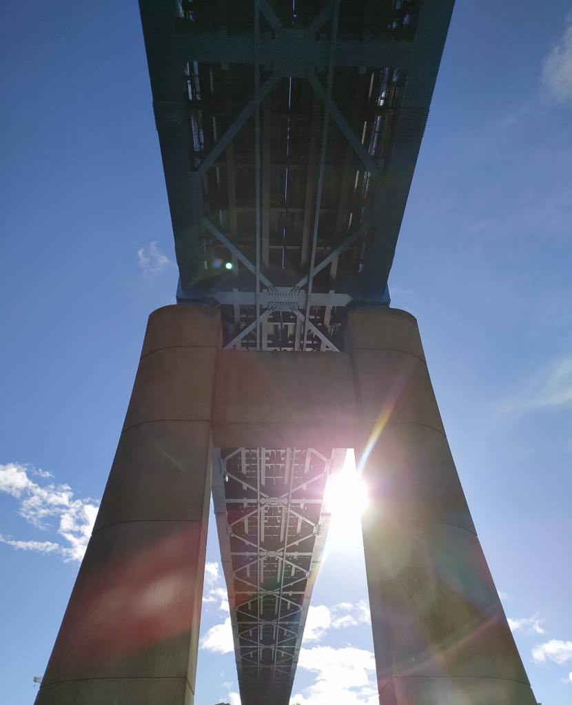 I am standing by the Metro Bridge contemplating the light that ripples through the water and the puddles on the paving stones. I like being here, waiting for the metro trains to pass over. The Metro Bridge is painted blue, and its simple clear lines stand out against the sky. The tracks and connections above. The concrete supports patterned with light that casts down and through the bridge. I look up to the blue of the sky, the sun and scattered clouds, the trees, the blue of the bridge. From this angle, it is as though they clarify each other. I stand and wait for a train to pass across, looking directly upwards, the lines of steel crossing over. The perspective of the bridge, its solid supports, the metro lines striking outwards across the river.