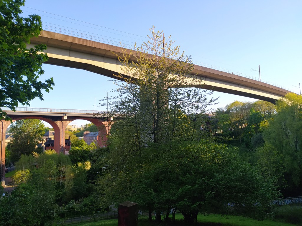 I find a sign, fading covered in elements, pinned to the railings: Northumberland Lead Works. The railings are grown over by leaves and branches, a tangle of interwoven strands, twisted layers of stems, leaves and branches. The mix of heritage, with iron railings slowly decaying, left to be covered and grown over. The sign itself weathered and greened by the elements. The Ouseburn Viaduct, its pillars and ironwork lattice half hidden by trees and adjacent structures.